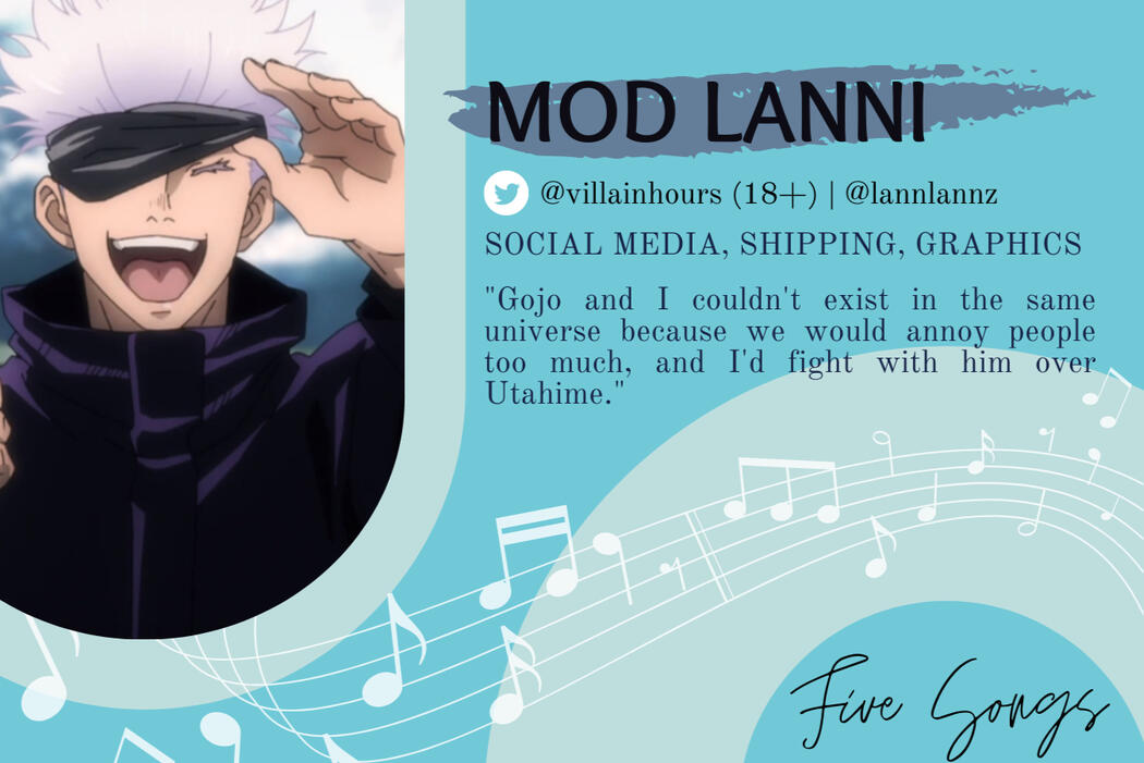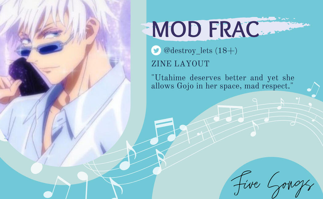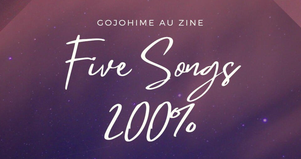Five Songs 200% is a zine celebrating the relationship between Gojo Satoru & Iori Utahime from Jujutsu Kaisen across various universes.